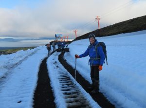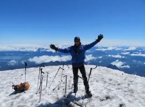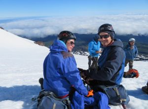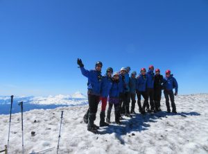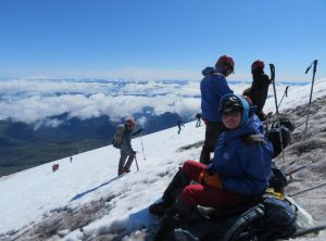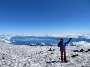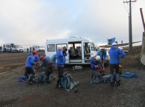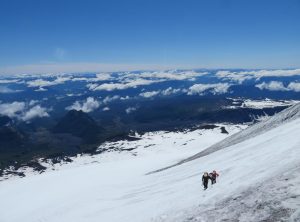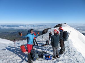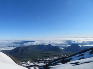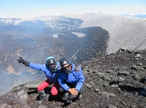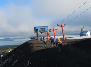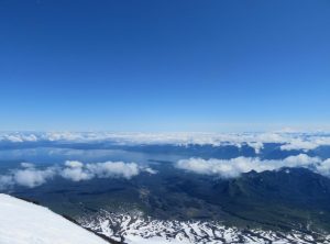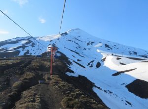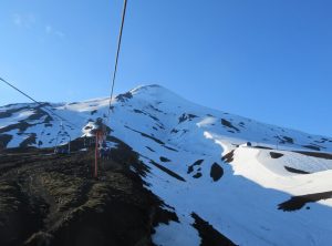 Bereits um 5:45 Uhr klingelte am Morgen der Wecker und als wir aus dem Auto kletterten hing auf der Spitze des Vulkans eine Wolke. Auf zum Startpunkt, noch schnell die Rucksäcke gepackt und los ging die Fahrt. Wir waren insgesamt zu acht und wurden von drei Guides begleitet. Es lagen 1600 Höhenmeter vor uns, 400 davon fuhren wir mit einem Sessellift. Reingesetzt und los ging es, der Sessel hatte keine Sicherung und Markus hatte die ganze Fahrt Angst rauszufallen. Als wenn wir nicht so oder so schon genug Adrenalin im Blut hatten. Als wir aus dem Lift ausstiegen, standen wir auch schon mitten im Schnee. Mittlerweile war die Sonne aufgegangen, kaum Wind und alle Wolken hatten sich verzogen – ideale Bedingungen! Steigeisen umgeschnallt, etwas laufen geübt und los ging es. Die nächsten vier Stunden im Gänsemarsch hinter einem der Guides her nach oben. Die anderen zwei Guides gaben uns Tipps und korrigierten unsere Schritte. Wir schlängelten uns quasi den Berg rauf und es war wirklich sehr sehr steil. Mit jedem Schritt rammten wir unsere Steigeisen in den gefrorenen Schnee, Schritt für Schritt. Die Aussicht von hier oben war fantastisch – einmal bin ich vor lauter Staunen über meine eigenen Füße gestolpert, hab mich aber schnell wieder aufgerappelt. Etwa 25 min vor der Spitze lagerten wir unsere Rucksäcke und hängten uns Gasmasken um, jetzt wurde es noch steiler. In einer Hand hatten wir einen Eispickel in der anderen einen Wanderstock. Wir konzentrieren uns auf unsere Füße und es wurde ganz still in der Gruppe.