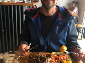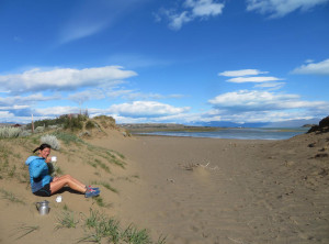 Zurück am Auto räumten wir etwas auf, auch das muss ja mal erwähnt werden, und fuhren die 45 Kilometer zurück in die Stadt. Es war Nikolaus und an diesem Abend lud Markus mich auf ein argentinisches Steak ein, dazu ein leckerer Malbec und für Markus einen gigantischen Nachtisch. Was für ein perfekter Tag. Die Nacht verbrachten wir wildcampend am Ufer des Lago Argentino, dem größten See des Landes. In ufernähe waren einige Flamingos unterwegs, die wir am Morgen mit einem Kaffee in der Hand von den Dünen aus beobachteten.