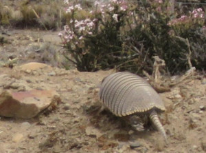 Von El Chaltén nach El Calafate fuhren wir etwa 250 km auf einer guten asphaltierten Straße, wir hatten die meiste Zeit eine grandiose Aussicht und ordentlich Wind. An einer Stelle flitzte ein Tierchen über die Straße, es handelte sich um ein Gürteltier, wir bremsten und versuchten, ein Foto zu machen. In dem Moment, an dem Markus ganz nah dran war, legte das Tierchen den Turbo ein und ließ uns hinter einer Staubwolke zurück. Kaum zu glauben, wie schnell es war.