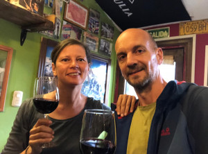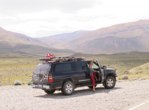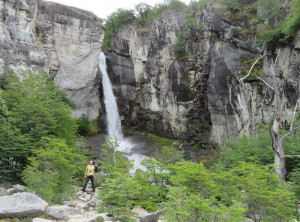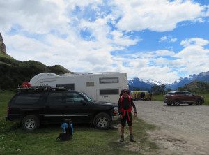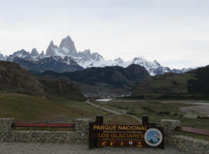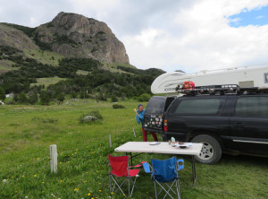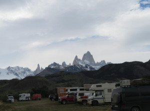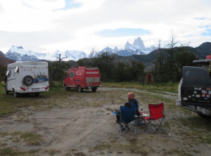 Nachdem wir Jeffrey vollgetankt hatten, steuerten wir die Touristeninfo am Ortseingang an. Wir informierten uns über eine mögliche 2 bis 3-Tageswanderung und tatsächlich gab es eine gute Option. Danach schauten wir uns etwas im Ort um. Man bemerkte sofort, dass El Chaltén eins der beliebtesten Ziele für Touristen in Argentinien ist. Auf den Straßen sahen wir viele junge Backpacker, aber es waren auch zum ersten Mal in Südamerika viele Camper unterwegs. Wir machten einen kleinen Spaziergang zu einem Wasserfall und am späten Nachmittag zu einem kleinen Hügel mit schönem Blick über die Stadt. Am Abend genehmigten wir uns noch einen Rotwein in einer Bar, bevor wir uns schlafen legten. Die einzige kostenlose Übernachtungsmöglichkeit war ein Stellplatz gegenüber der Touristeninfo, auf dem auch viele andere Camper standen. Einige davon auch mit deutschem Kennzeichen, für mehrmonatige Touren durch Südamerika lassen viele ihre Fahrzeuge über den Ozean hierher verschiffen.