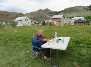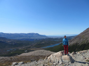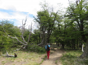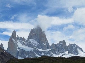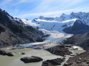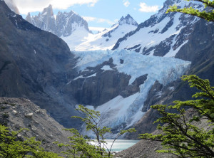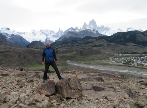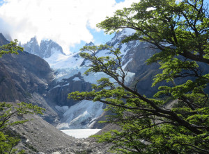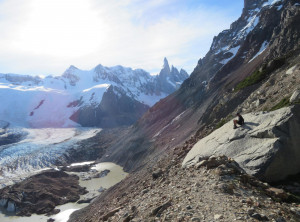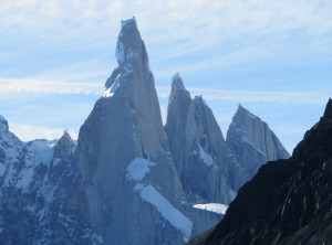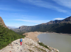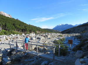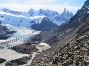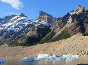Zurück am Campingplatz frühstückten wir, bevor wir uns auf den 11 Kilometer langen Weg zum nächsten Übernachtungsplatz machten. Auch dort schlugen wir zunächst unser Zelt auf, bevor wir wieder ohne Gepäck 200 Höhenmeter zu einem Aussichtspunkt auf einen weiteren bekannten Berg aufstiegen, den Cerro Torre, ein fast nadelförmiger sehr steiler Gipfel. Unter uns lag ein See, in den ein Gletscher mündete und auf dem deshalb viele kleine Eisberge trieben. Das Wetter war grandios und in der Sonne war es wieder richtig warm. Am nächsten und letzten Tag hatten wir nur noch 9 Kilometer zurück zu Jeffrey zu wandern. Morgens war es bewölkt und wieder kalt. Also wanderten wir erstmal eine Stunde, bevor wir frühstückten. Zurück in El Chaltén tranken wir noch einen Kaffee und waren sehr zufrieden mit dieser schönen Wanderung bei fast perfektem Wetter. Mittags verließen wir dann den Ort Richtung El Calafete.