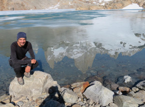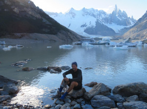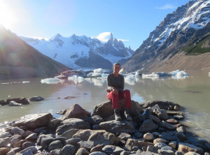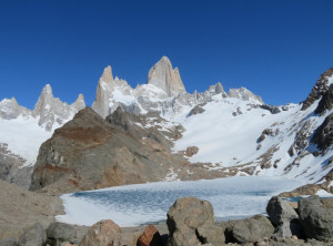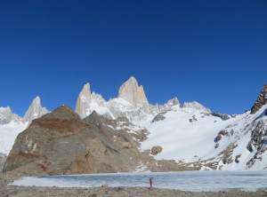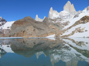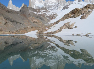 Nachdem wir unser Zelt aufgeschlagen hatten, machten wir ohne Gepäck einen Abstecher zum Gletscher Piedras Blancas, mittlerweile war es in der Abendsonne richtig warm. Erschöpft und müde fielen wir anschließend in den Schlaf.Am nächsten Morgen wollten wir eigentlich zum Sonnenaufgang ohne Gepäck den Aufstieg zum See Lago de los tres machen, aber als der Wecker um 4 Uhr morgens klingelte, war vor allem ich dazu zu müde und außerdem ziemlich durchgefroren. Wir schliefen also noch etwas und starteten den Ausflug erst gegen 8 Uhr. Unterwegs stellten wir fest, dass es nicht wie gedacht 200 sondern 400 Meter nach oben ging. Egal, oben angekommen lag der schöne Gipfel des Fitz Roy hinter dem fast komplett zugefrorenen kleinen See direkt vor uns. An einer eisfreien Stelle spiegelte sich das Panorama sogar perfekt im Wasser. Was für ein grandioser Anblick!