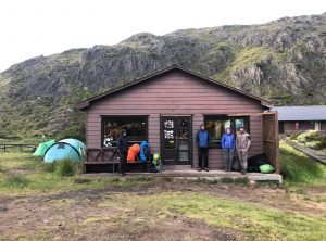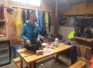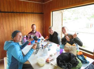 In der Nacht zog eine Regenfront auf, die sich auch hartnäckig bis mittags hielt. Im leichten Nieselregen mit eiskalten Fingern bauten wir unser Zelt ab. Wir streiften unsere Regencapes über und wanderten uns warm. An diesem zweiten Wandertag lagen 18 km und 330 Höhenmeter vor uns. Anfangs war es windig und grau. Neben uns waren etwa 40 andere Wanderer auf dem Weg. Wir trafen Adrian aus Polen, der sich am Wegesrand einem Kaffee kochte. Der Regen hatte aufgehört, da konnte man sich sich schon mal eine Pause gönnen. Für uns ging es weiter und mit jedem Kilometer wurde der Himmel blauer.  Als wir unser Ziel, den Campingplatz Dickson erreichten, hatten wir einen klaren Blick über die umliegenden Berge. Wir packten aus und ließen das Zelt in der Sonne trocknen. Der Campingplatz ist wunderschön gelegen, auch hier gibt es warme Duschen, einen kleinen Shop und ein Holzhaus, in dem windgeschützt Essen zubereitet werden darf. Wir unterhielten uns mit den anderen Wanderern, die aus allen Teilen der Welt angereist waren: Kanada, Spanien, Belgien, England, USA, Frankreich und natürlich einige Deutsche und Schweizer.