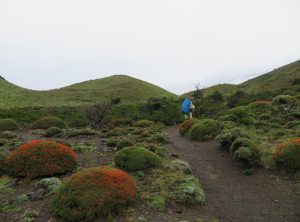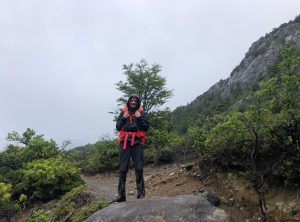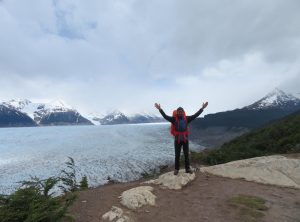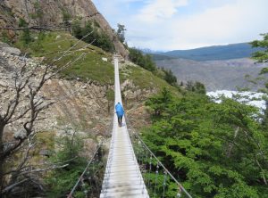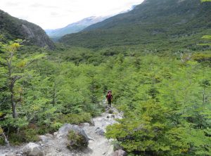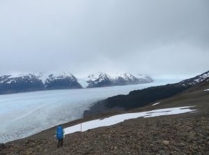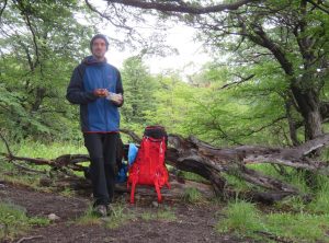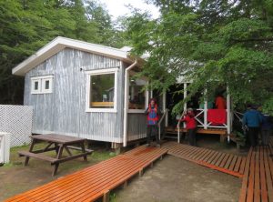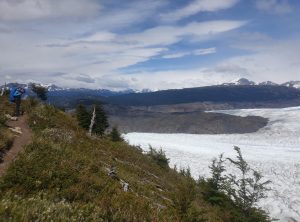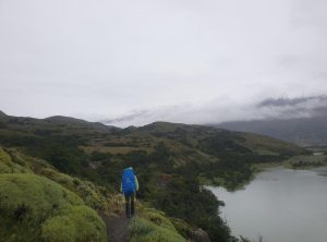 Nach etwa 3,5 h erreichten wir den höchsten Punkt des Tages und blickten zum ersten Mal auf die eisige Zunge des Grey Gletschers. Es war regnerisch und der schwache Wind eisig, im Grunde hatten wir Glück mit dem Wetter, da starker Wind hier oben oft die größte Herausforderung ist. Wir machten ein paar Fotos und weiter ging die Wanderung. Jetzt lagen 1200 m abwärts auf einer Strecke von 9 km vor uns. Einige Abschnitte waren so steil, dass es recht mühsam war, hinab zu steigen. Nach mehr als 2 h erreichten wir den kleinen Campingplatz „Paso“, an dem wir eine Rast einlegten. Die Temperaturen lagen weiterhin im einstelligen Bereich und eine Art Carport bot uns Schutz. Gemeinsam mit den anderen Wanderern freuten wir uns, die erste Etappe geschafft zu haben. Wir tranken einen warmen Tee und machten uns bald wieder auf den Weg.