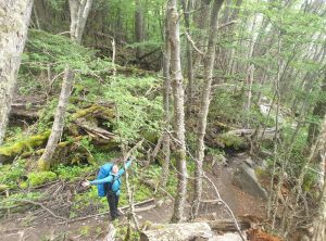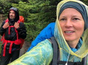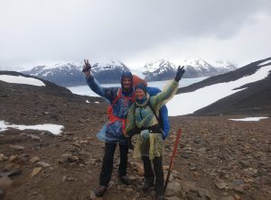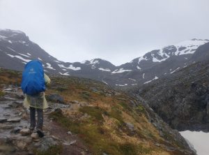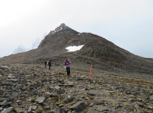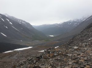 Am Morgen war das Zelt fix abgebaut, wir frühstückten und überpünktlich standen wir um 6:50 startklar bereit. Bei leichtem Regen und um die 5 Grad marschierten wir durch den matschigen Wald, weiter aufwärts auf einem Geröllfeld, bis wir schließlich durch den Schnee stapften. Unsere Rucksäcke waren zwar schon leichter als am ersten Tag, aber gerade bei den Metern nach oben merkten wir die zusätzliche Last, prima so wurde uns wenigstens nicht kalt.