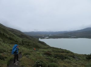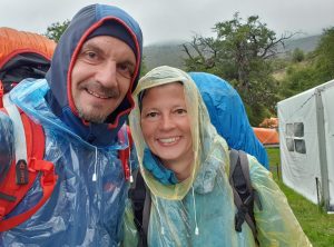 Wir erreichten den Campingplatz Cuernos, für den wir keine Reservierung hatten. Bei einer Pause in der warmen Campingküche stärkten wir uns mit warmem Tee und verschlangen unsere letzten Lebensmittel. Da wir nass waren und in Bewegung bleiben wollten, packten wir schnell wieder unsere Sachen zusammen und begaben uns auf die letzte Etappe. Noch 12 km bis zum Parkplatz, an dem Jeffrey auf uns wartete. An einem türkisblauen See ging es auf und ab. Es nieselte nun nur noch und wir schöpften Hoffnung, etwas zu trocknen. Tatsächlich stoppte der Regen zwischendurch mal für eine Stunde und unsere Klamotten trockneten an. Die Landschaft war wunderschön und zwischendurch erhaschten wir immer mal wieder einen Blick auf die wolkenverhangenen Berge. Gegen 16 Uhr erreichten wir unser Ziel – Yehaaaaa! Wir pellten uns aus den nassen Klamotten, nutzten die heisse Dusche des Campingplatzes und legten uns ins gemütliche Bett von Jeffrey. Unser Kühlschrank spendierte uns ein Bierchen. Unglaublich gemütlich! Für unsere Freunde der Wanderung stand nun noch das Finale auf dem Programm, der Aufstieg zu den Torres, diese schöne Wanderung hatten wir ja schon am ersten Tag gemacht.