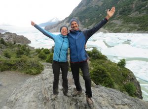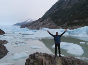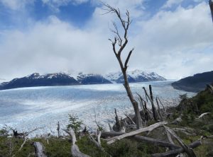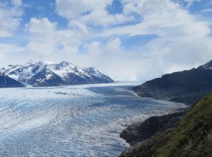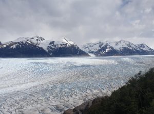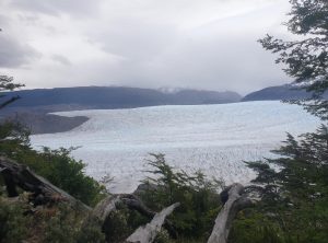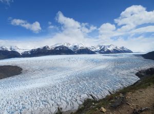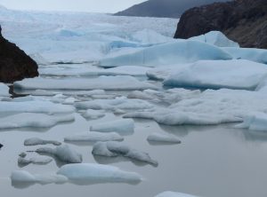 Die nächsten sieben Kilometer führten uns am Ufer des Lakes Grey entlang. Die Aussicht war einmalig. Ab und zu kämpfte sich sogar die Sonne durch und in Kombination mit dem auf und ab des Weges wurde uns nochmals richtig warm. Wir staunten immer wieder über das Wunder, welches uns die Natur hier bot. Nach insgesamt 9 h erreichten wir den vierten Campingplatz unserer Reise am Fuße des Gletschers Grey. An diesem Punkt der Wanderung treffen die „O“ Wanderer zum ersten Mal auf die „W“ Wanderer und einige Tagestouristen. Es war also Schluss mit der Gemütlichkeit und es mischten sich viele fremde Gesichter in unsere vertraute Gemeinschaft. Dennoch schafften wir es, uns beim Abendessen über die Erlebnisse des Tages auszutauschen. Besonders wird uns Adrian, den wir bereits ins Herz geschlossen haben, in Erinnerung bleiben. In der Hektik am frühen Morgen vor der Passüberquerung hat er vergessen, sein Zelt hinten an den Rucksack zu schnallen und stand nun ohne Zelt aber mit einem Lächeln im Gesicht da. Zum Glück konnte man vor Ort Zelte mieten, die zudem noch recht schick und besonders wetterfest sind. Am nächsten Morgen machten wir noch einen Abstecher zum Ufer des Sees und bestaunten die Eisberge aus der Nähe. Zurück am Quartier, tranken wir einen Kaffee und machten uns dann auf den Weg zum größten Campingplatz unserer Runde, dem Paine Grande.