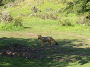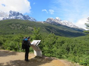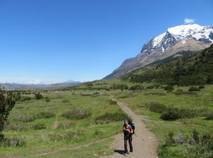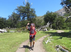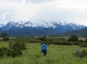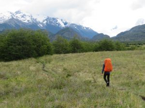 Den ersten Tag unserer mehrtägigen “O” Wanderung – eine Runde mit Sack und Pack um die Torres gingen wir ganz entspannt an. Erstmal schliefen wir aus und frühstückten gemütlich bei Sonnenschein mit Bergblick. Wir bekamen sogar Besuch von einem neugierigen Fuchs, der wohl wusste, dass da wo Menschen sind auch Nahrung ist. Er huschte direkt an uns vorbei. Nach dem Frühstück hieß es packen. Die nächsten 5 Nächte wollten wir im Zelt verbringen und uns selber versorgen. Wir türmten alles, was wir mitnehmen wollten, auf und gingen nochmals unseren Speiseplan durch. Müsli, Spaghetti, Tortellini, Thunfisch, Eier, Kartoffelbrei, ein Marzipanbrot, Zwieback, Kekse, Milchpulver, Kaffee, Tee und und und landete auf dem Stapel. Wir verstauten alles in unseren Rucksäcken und waren gegen 12 Uhr startklar. Nun hatten wir noch etwas Zeit und snackten noch ein paar Reste vom Vortag. Nach dem Mittagessen sattelten wir auf und machten uns auf die erste Etappe der Umrundung der Torres de Paine. Das Ziel der Campingplatz Serón war 13 km und 250 Höhenmeter entfernt. Besonders Markus, der das Zelt und den Löwenanteil unserer Lebensmittel im Rucksack hatte, musste schwer tragen. Trotz der Last auf dem Rücken genossen wir die erste Etappe, die uns leicht bergauf über saftige Wiesen führte. Auf einer Koppel fanden wir ein Hufeisen, na also dieser Ausflug versprach einmalig zu werden.