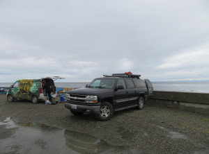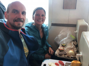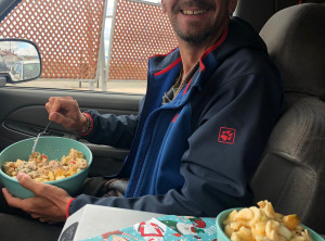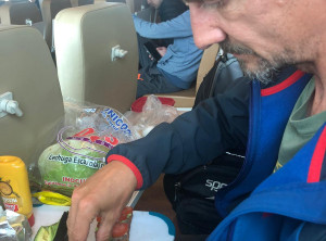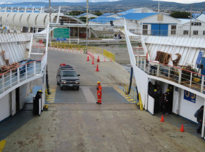 Pünktlich um 15 Uhr stellten wir uns am Fährhafen hinter die wenigen Fahrzeuge, die vor uns da waren. Wenig später legte die Fähre von Feuerland kommend an und wurde zunächst entladen. Da nur der Fahrer im Auto sitzend auf das Schiff fahren darf, musste Niko aussteigen und den Fußgängerweg nehmen. Nachdem ich Jeffrey auf der Fähre abgestellt hatte, trafen wir uns auf dem Passagierdeck. Während der sehr ruhigen Überfahrt hatten wir viel Zeit für ein ausgiebiges Picknick. Es gab das in Punta Arenas gekaufte Vollkornbrot mit Avocodo, Tomaten, Ei und Käse und Marmelade wir schlemmten voller Vorfreude auf Feuerland.