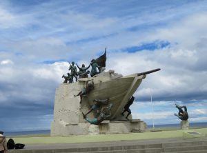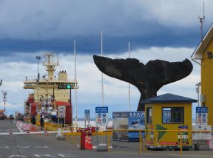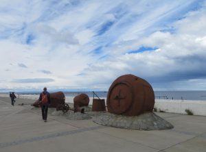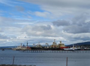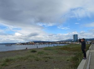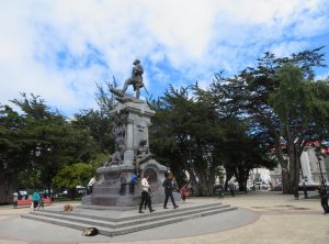 Wir übernachteten neben zwei anderen Campern direkt am Meer an der Magellanstraße. Hier werden wohl des öfteren Delfine gesichtet, wir sahen aber leider keine. Am nächsten Morgen kauften wir uns als erstes Tickets für die Nachmittagsfähre nach Porvenir auf der Insel Feuerland. Da wir erst um 15 Uhr am Hafen parat stehen mussten, hatten wir noch ein paar Stunden Zeit, um uns in Punta Arenas umzuschauen. Wir fuhren zunächst auf einen Parkplatz am Meer und frühstückten ausgiebig. Danach schlenderten wir über den Hauptplatz zu einem Aussichtspunkt, von wo wir einen schönen Blick über das Meer und die davorliegende Stadt hatten. Eine besondere Schönheit ist Punta Arenas nicht und darum waren wir auch nicht traurig, dass wir hier nicht langer blieben. Auf dem Weg zum Auto fanden wir in einer Bäckerei noch ein leckeres Vollkornbrot In einer deutschen Bäckerei, besuchten noch den kleinen Fischmarkt, bevor wir aus der Stadt raus bis zum Fähranleger fuhren.