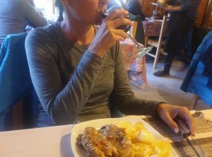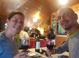 Nach Cochrane lagen weitere 70 Kilometer Schotter vor uns und wir wurden zum Abschluss noch einmal kräftig durchgeschüttelt. Wir kamen gegen 17 Uhr im kleinen Ort an und reservierten uns einen Tisch für 20 Uhr in einem Restaurant. Danach öffneten wir uns erstmal eine Flasche Wein und tranken auf unsere Familien daheim, das ist schon unser zweites Weihnachten in der Ferne.Kurz nach 8 betraten wir das gemütliche Restaurant und waren froh, das wir reserviert hatten, denn es waren alle Tische belegt. Wir bestellten eine weitere Flasche Wein und wählten als Gerichte eine gefüllte Hähnchenbrust und ein Stück Schweinefleisch. Beides war sehr lecker und wir hatten einen schönen Abend. Zurück am Auto aßen wir als Nachtisch dann noch den Stollen, den Kerstim uns im November aus Deutschland mitgebracht hatte. Feliz Navidad!
