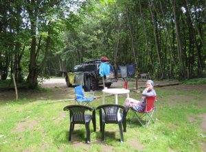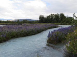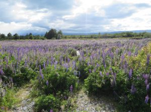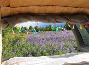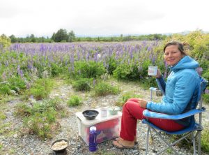 Der erste Blick an diesem Morgen fiel auf das lila Lupinenfeld vor unserem Heckfenster, so schön. Wir frühstückten draußen, obwohl es mit 12 Grad kühl war und es immer wieder etwas tröpfelte. Der Himmel zog sich langsam zu. Wir wollten an diesem zweiten Weihnachtsfeiertag eine gemütliche 16 km Wanderung ohne Steigung machen. Die Tour versprach eine super Aussicht, leider hatten wir die 15 km Anreise über einen schmalen holprigen Weg unterschätzt. Wir führten wilde Diskussionen, ob wir weiter fahren oder umkehren sollten. Jeffrey kämpfte sich tapfer durch 11 km bis zu einer Brücke, über die wir uns dann doch nicht trauten. Einige alte Bahnschwellen und kein Geländer. Uns blieb der Fußweg, Jeffrey liessen wir auf der anderen Flussseite zurück. Nach vier Kilometern erreichten wir den eigentlichen Start der Wanderung. Der Himmel war grau in grau und die Aussicht, mmh sagen wir mal wild. Nach 1,5 h kehrten wir um und waren noch pünktlich vor der Regenfront am Auto. Die nächsten 3 h regnete es, was das Zeug hält.