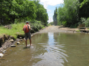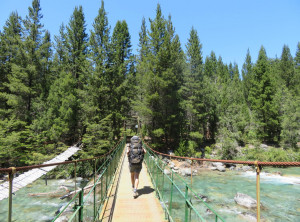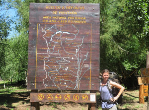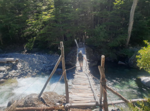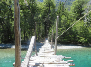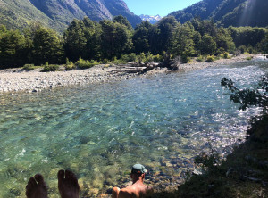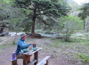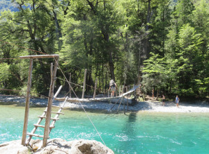 Für die nächsten zwei Tage hatten wir uns eine Wanderung mit einer Übernachtung im Zelt rausgesucht. Wir fuhren zum Startpunkt, packten unsere Rücksäcke und bei schönstem Wetter ging es los. Da mittlerweile die Hauptreisezeit für die Argentinier war, waren wir hier nicht alleine und besonders auf den ersten Kilometern dieses schönen Weges trafen wir viele andere Wanderer. Nachdem wir wagemutig eine sehr marode und selbst zusammengezimmerte Hängebrücke überquert hatten, aßen wir etwas und wollten danach im Fluß baden. Wir schafften es aber nur bis knapp über Knie und das tat schon weh. Der Fluss war eiskalt, aber ein paar abgehärtete wagemutige Argentinier nahmen trotzdem ein Bad.