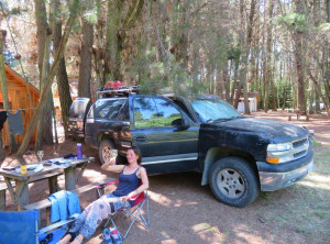 Nach einer zweistündigen Fahrt kamen wir mittags in El Bolsón an. Wir suchten uns für zwei Nächte einen gemütlichen kleinen Campingplatz. Auf dem Platz stellten wir Jeffrey an einer schönen Stelle unter Pinien ab und gingen erstmal eine Stunde laufen. Nach einer erfrischenden Dusche setzten wir uns an den Picknicktisch, mit dem jeder Stellplatz ausgestattet war. Bei schönstem Sonnenschein und 30 Grad tranken wir erstmal einen kühlen Weißwein. Schließlich war heute Silvester.
