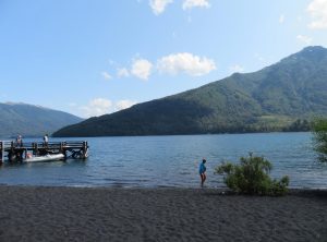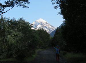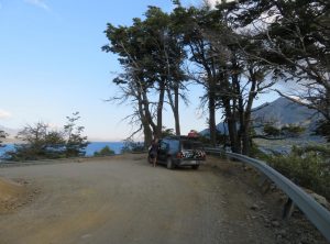 Wir kamen kurz nach 8 Uhr am Eingang des Nationalparks an und erwischten noch eine Mitarbeiterin, die gerade die Tür zum Büro abschloß. Bezahlen könnten wir heute nicht mehr, aber wir sollen einfach weiterfahren, sagte sie. Gesagt, getan. Wir fuhren die 40 Kilometer Schotterpiste zum Ausgangspunkt der Wanderung zum Fuße des über 3.700 Meter hohen schneebedeckten Vulkans Lanín. Die Straße verlief die gesamte Strecke oberhalb eines Sees und wir fuhren in den Sonnenuntergang hinein. Sehr schön! Am Parkplatz angekommen bereiteten wir noch unsere Rucksäcke für die Wanderung vor. Wir wollten früh starten, da es wieder sehr warm werden sollte. Bevor wir uns schlafen legten, setzten wir uns im letzten Tageslicht noch kurz an den Strand des Sees.