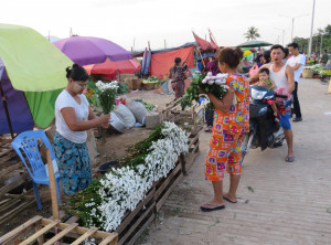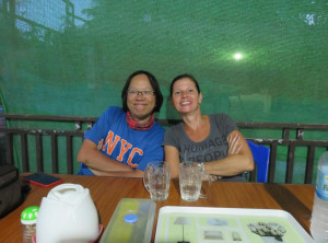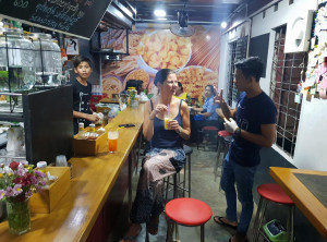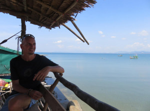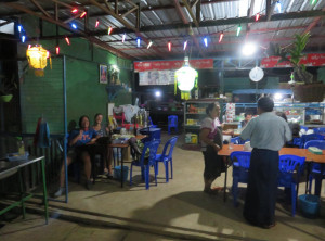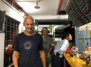 Es gibt an der Promenade viele Restaurants und Stände mit Souvenirs und im Wasser badeten Einheimische mit großen luftgefüllten Reifen. Kurz vor der Dämmerung machten wir uns auf den Rückweg nach Dawei, wo wir uns abends noch mit Francis zum Burgeressen verabredet hatten. Niko und Francis gaben sich jeweils mit einem Burger zufrieden – ich habe drei gegessen. Anschließend sind wir noch in die angesagteste Kneipe der Stadt gegangen – einen Biergarten in der Nähe.