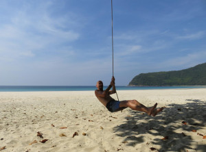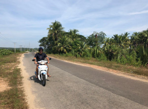 Schließlich ging alles recht zügig, die Ersatzteile kamen an, wurden eingebaut und da es erst 15:30 Uhr war, beschlossen wir, doch noch zum drei Kilometer entfernten Paradise Beach zu fahren. An diesem Traumstrand gibt es ebenfalls nur ein paar Bungalows. Der Pfad zu diesem Ort ging auch auf und ab und war am Ende kaum breiter als unser Roller, aber es hat sich mehr als gelohnt. Dieser Strand hat den Namen wirklich verdient! Es ist ein kilometerlanger einsamer von Kokospalmen gesäumter Strand. An diesem paradiesischen Ort trafen wir Francis, unseren Freund aus Hong Kong wieder, er ließ sich im blauen Wasser treiben. Wir genossen gemeinsam die letzten Sonnenstrahlen des Nachmittags und fuhren dann zusammen zurück Richtung Dawei. Wir machten noch einen Stopp zum Abendessen und es ging alles glatt, bis wir in der Dunkelheit gegen 20:30 wieder im Hotel ankamen.