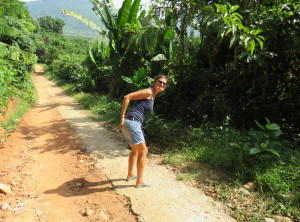 Die Piste wurde immer schmaler und es ging steil bergauf und bergab. Der Motorroller begann an den Steigungen merkwürdige Geräusche am Hinterrad zu machen und wir schafften es kaum noch aufwärts. An einem sehr steilen Berg hob deswegen plötzlich das Vorderrad ab und wir fuhren ein Stück auf dem Hinterrad, bevor unser Roller auf dem Seitenstreifen und wir mit Karacho auf dem Hintern landeten. Puhh! Was für ein Schreck, wir mussten uns erst mal sammeln und durchatmen – Niko musste sich hinsetzen und ich zitterte am ganzen Körper.