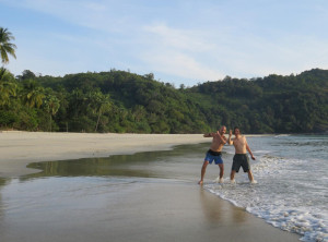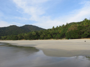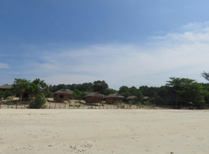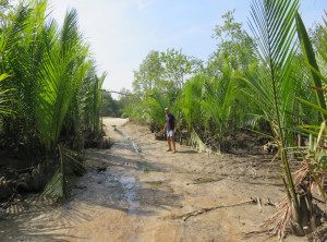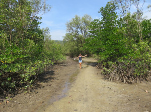 Zum Glück ist außer einem Schaden am Rücklicht des Rollers und blauen Flecken an unseren Hinterteilen nichts passiert! Der Roller schien noch zu funktionieren. Wir ließen uns nicht unterkriegen und fuhren auch noch die letzten zwei Kilometer auf und ab Richtung Strand – es ging durch ein kleines Dorf und der Weg wurde wieder leichter befahrbar. Die letzten zwei Kilometer zum Strand sind nur bei Niedrigwasser und zu Fuß durch Mangrovenwälder zu bewältigen. Daher stellten wir unser Fahrzeug ab und machten uns auf den Fußweg. Nach ca. 30 Minuten sind wir endlich am Meer angekommen. Es erstreckte sich rechts und links kilometerweit ein breiter weißer Sandstrand fast ohne Menschen – ein Traum! Es gibt an diesem Strand ein Resort mit ein paar Bungalows, ansonsten verläuft sich niemand an diesen Ort. Nach der anstrengenden Anreise überlegten wir keine Sekunde und sprangen sofort ins warme Wasser. Nach der Erfrischung schaukelten wir noch etwas im Wind und machten und auf den Rückweg.