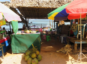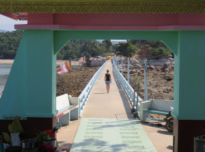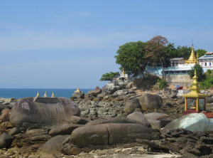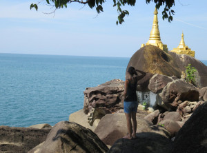 Am nächsten Tag schliefen wir etwas länger und genossen wieder unser Frühstück, bevor wir uns erneut auf das Moped setzten. Diesmal war das Ziel eine ca. 30 Kilometer entfernte Pagode, die auf einer kleinen Insel im Meer liegt. Der Weg dorthin war fast durchgängig asphaltiert und damit um einiges leichter zu fahren als die Strecke am Tag zuvor. Die Umgebung der Pagode war traumhaft schön, diese liegt auf einem kleinen Felsen und überall nah und fern sah man helle Sandstrände aufblitzen. Den Weg zur Pagode säumten einige Restaurants mit Holzterrassen über dem Wasser und Blick auf einen schönen Strand. Wir umrundeten die kleine Insel mit der Pagode einmal – auf den Steinen, die die Insel umgeben, saßen einige Burmesen mit ihrem Samstagspicknick und ein paar Mönche schauten von hier auf das weite Meer hinaus. Bevor wir den Rückweg zu unserem Roller antraten, gönnten wir uns in einem der Restaurants mit Meerblick eine frische Kokosnuss.