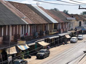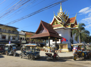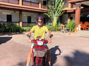 Wir trafen nur wenige andere Touristen an, es gefiel uns gleich besser als zum Beispiel in Vang Vieng. Am von alten Kolonialhäusern umgebenen Hauptplatz der Stadt, dem Fountain Square, fanden wir einen Motorradverleih, bei dem wir uns eine gute Maschine ausleihen konnten.
