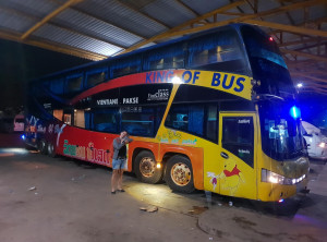 Unser nächstes Ziel war die Stadt Thakhek, da wir als Abschluss in Laos eine ca. 500 Kilometer lange Rundtour mit dem Motorrad, den Thakhek Loop, fahren wollten. Also stiegen wir in Vang Vieng zunächst in einen Minibus in Richtung der Hauptstadt Vientiane, wo wir in den Nachtbus nach Südlaos umsteigen mussten.