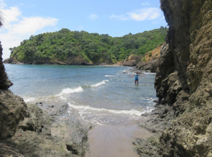 Ein zwei Kilometer langer Wanderweg sollte uns vom Parkplatz zum Aussichtspunkt führen. Etwa nach der Hälfte des Weges gelangten wir über eine Treppe steil nach unten direkt zum Meer, der Pfad führte geradewegs ins Wasser. Es war Hochwasser und zu diesem Zeitpunkt ist der Wanderweg geflutet. Kurzerhand zogen wir unsere Shorts aus und stolzierten mit den Wertsachen über dem Kopf los. Hin und wieder schwappte eine Welle vorbei, so dass unsere T-Shirts auch bald nass waren. Wir gelangten etwas holprig ans andere Ufer und mussten feststellen, dass es auch hier nicht ohne zu schwimmen weiter ging. Also bei Hochwasser keine Chance. Da wir eh schon so gut wie nass waren, schwammen wir ne Runde in der wunderschönen Bucht und traten den Rückzug an.