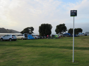 Viele Campingplätze sind bis 19:00 besetzt, dann werden die Tore geschlossen – einen Plan für die Nacht hatten wir nicht. Gegen 19:30 steuerten wie einen Platz kurz hinter Auckland an, auf dem wir aber mit dem Zelt nicht bleiben durften. Es waren nur Fahrzeuge mit eigener Toilette erlaubt, daher ging unsere Reise weiter. In der nächsten Bucht – des Ortes Kawakawa Bay sahen wir aus der Ferne einige Zelte. Yuhuuu ein Campingplatz! Am vermeintlichen Campingplatz angekommen standen wir vor etwa 30 Zelten und dem Schild Zelten verboten. Die Camper hatten Zelte, Stühle, Tische und Grills bereits aufgebaut. Es herrschte reges Treiben, es campten dort einige Maori Familien mit Kind und Kegel und es sah ganz gemütlich aus.