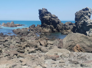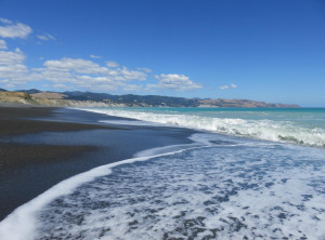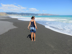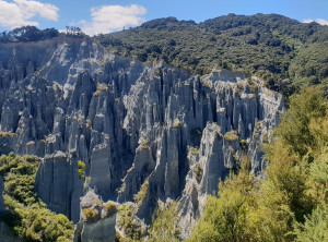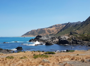 Am nächsten Morgen starteten wir nach dem Frühstück bei blauem Himmel und Sonnenschein in Richtung Cape Palliser. Unseren ersten Halt machten wir bei den Pinnacles, das sind felsige Klippen, die links der Cape Palliser Road aufragen. Rechts der kilometerlangen Straße sahen wir die schwarzen Lavasandstrände und das türkisblaue Meer. Wir wanderten etwa 40 Minuten stetig aufwärts, bis wir den Aussichtspunkt mit direktem Blick auf die Pinnacles erreichten.