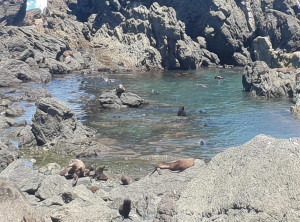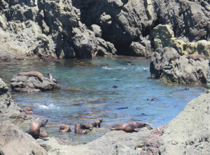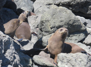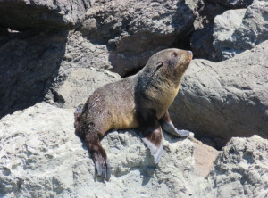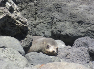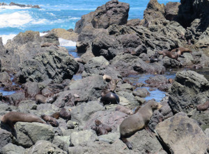 Abwärts ging es deutlich schneller, allerdings mussten wir mal wieder Schotter und Geröllpisten passieren. Vom Wandern hatten wir für diesen Tag erstmal genug. Unser Auto brachte uns zur nächsten Attraktion, die Robbenkolonien, die sich am Aufzuchtsplatz am südlichen Zipfel der Nordinsel tummelten. Wir hofften Robben zu Gesicht zu bekommen und waren sehr überrascht, als sich an der beschriebenen Stelle gleich hunderte Robben tummelten. Die Tierchen leben am Meer und zwischen den Felsen an der Küste, sie sonnten sich, schwammen und die Jungtiere tollten umher. Wir beobachteten das Treiben voller Begeisterung, die Robben blieben von uns völlig unbeeindruckt. Außer uns waren nur zwei weitere Touristen an diesem Ort.
