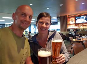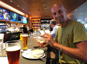 Es ging im Schneckentempo vorwärts und letztendlich schafften wir es nicht rechtzeitig. Als Alternative wurde uns ein Flug fast 7 Stunden später nach Housten, dort wieder 5 Stunden Wartezeit und dann der Weiterflug nach Mexico angeboten. Alles in allem sollten wir also mindestens 12 Stunden später als geplant an unserem Ziel ankommen. Eine richtige Alternative gab es leider nicht. Nach etwas Protest bekamen wir noch Essensgutscheine über USD 40 und dann hieß es erstmal warten. Wir nahmen vor der Tür des Flughafens einen Atemzug kalifornische Luft und arbeiteten an unserem Blog. Die Hälfte der Essensgutscheine investierten wir in Bier, bevor es um 20 Uhr abends endlich losging. Wir waren jetzt schon fast 24 Stunden unterwegs…