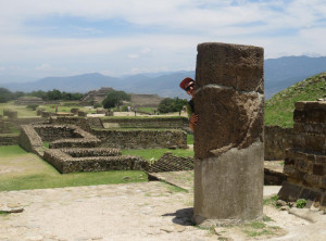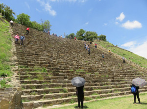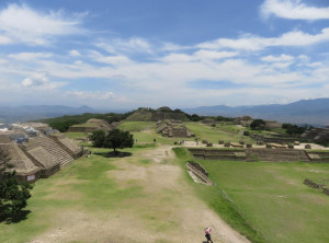 Am Ziel angekommen zahlten wir Eintritt und fanden ein riesiges, gepflegtes Arenal vor. Wir erkundeten die erste Hälfte des Geländes und stiegen überdimensionale Treppenstufen zum höchsten Punkt hinauf. Die Aussicht über dieses prähistorische Dorf sowie die Stadt Oaxaca am Fuße des Berges entlohnte uns für die Anstrengungen. Dennoch machten wir anschließend erstmal eine Siesta. Wir legten uns unter einen schattenspendenden Baum und erholten uns, das macht man doch so in Mexiko’s Mittagshitze, oder?