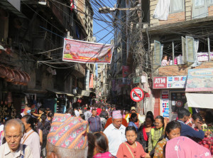 Wir haben im Stadtviertel Thamel das Hotel Trekkers Home gebucht, für 10 € haben wir ein nettes, großes Doppelzimmer mit Bad und kleinem Balkon im 3. OG. Thamel ist seit über vier Jahrzehnten das Zentrum der Touristenindustrie, von hier starten fast alle wanderbegeisterten Urlauber ihre Trekking Touren im Himalaya. Falls das ein oder andere zu Hause vergessen wurde, ist das kein großes Problem. Es gibt hier vom Schlafsack über Handschuhe und Wollmützen bis zum Wanderschuh alles zu kaufen – von allen bekannten Marken, oftmals original getreu nachgebaut. In den engen Gassen wimmelt es nur so von Menschen – neben den Einheimischen auch sehr viele Touristen aus allen Ländern der Welt.