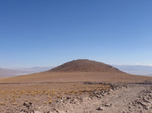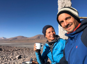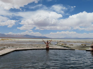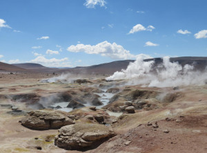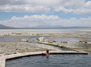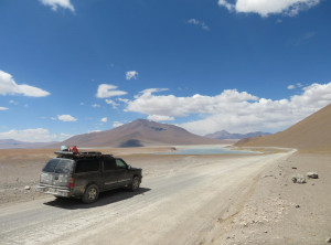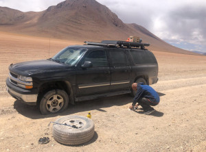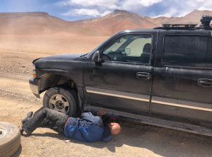 Los ging es nur 30 km und eine Stunde Fahrzeit entfernt liegt die nächste Attraktion, Geysire! Die Erde brodelte, es dampfte und zischte. Wir schlugen erstmal etwas entfernt unser Lager auf und frühstückten – mit Aussicht. Anschließend schauten wir uns noch etwas um und setzten bald unsere Fahrt fort. Die Wege waren weiterhin schlecht, Sand, Geröll und Steine wechselten sich ab. Zum Glück war es zum nächsten Stop auch nicht weit. Eine heisse Quelle mit Blick auf Flamingos. Toll, so ein Bad hatten wir auch dringend nötig. Wir genossen das warme Wasser und quatschten etwas mit anderen Touristen. Drei Studenten aus Santiago erzählten etwas über die aktuelle politische situation und wie sie die Lage einschätzen. Frisch gebadet ging es weiter. Wir freuten uns gerade, dass wir so gut im Plan liegen und berieten uns bezüglich der Wanderung für den nächsten Tag, als Jeff aufpiepste – wir sollten den Reifendruck prüfen. Na gut – während Markus mir unserem in Peru gekauften Messgerät die Reifen rechts prüfte lief ich ums Auto. Der Reifen vorne links zischte unüberhörbar. Es musste auch nicht mehr gemessen werden, innerhalb von Minuten war der Reifen platt wie ne Flunder.