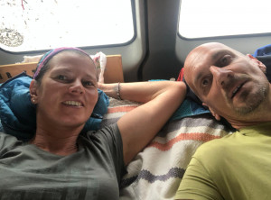 Gemeinsam schafften wir es relativ schnell Jeffrey aufzubocken und den Reifen zu wechseln. Yehaaa!!! Während Markus, Attilio und ich abwechselnd über dem Handbuch, im Staub und am Reifen hantierten, verschwand Jolie im Van und überraschte uns nach getaner Arbeit mit Pasta. Mit einer guten Flasche Wein aus Peru machten wir uns es nun also zu viert im Van gemütlich. Die zwei haben die kopierte Innenausstattung selber gemacht und leben mit einem gemütlichen Hochbett einer IKEA Küche und einer sitzecke recht luxuriös auf vier Rädern.