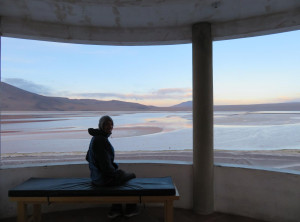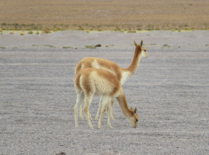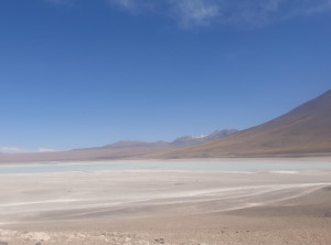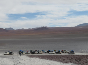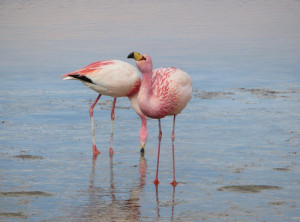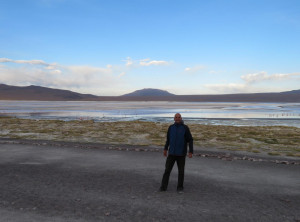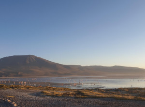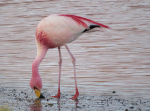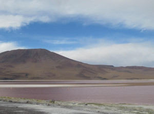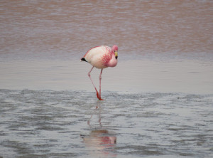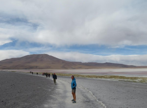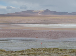 Wir genossen die schöne Landschaft, passierten einen Salzsee und beobachteten immer wieder Vicunjas, die seltene Kamelart, die in den Anden lebt. Ab und zu sahen wir einen Jeep, der Touristen chauffierte. Gegen 16 Uhr erreichten wir unser Ziel, schon von weitem schimmerte die Laguna Colorada rosa, dies lag nicht zuletzt an den 1000den Flamingos, die sich im Wasser tummelten. Noch um eine lang gezogenen Kurve und wir erreichten den Parkplatz. Tatsächlich ergatterten wir die letzte Parkbucht. Hier standen bestimmt 40 Jeeps, die jeweils zwischen 2 und 6 Touristen an Bord hatten. Es war also voll und an dieser Seite der Lagune hatten sich die vielen Vogel etwas Richtung Mitte des Gewässers zurück gezogen. Wir spazierten eine Runde zwischen den Touristen umher und genossen die Kulisse. Wir freuten uns aber auch darauf, dass die Touren dann auch bald wieder aufbrechen und warteten erstmal ab. Etwa eine Stunde später hatten wir die Lagune für uns. Wir machten dieselbe Runde nochmals, viel besser!