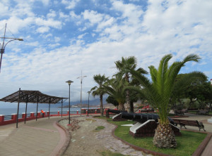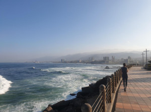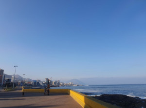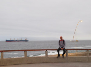 Nach dem Stop ging es weiter 200 km in Richtung Pazifikküste, die Landschaft war eher karg. Wir befanden uns immer noch in einer der trockensten Gegenden der Welt. Und dann endlich erreichten wir das Meer. Leider hing an der Küste eine dicke Nebelwolke. Es war warm aber eben auch grau. Wir checkten in das günstigste Hotel im Ort ein, welches trotzdem mehr als doppelt so teuer war wie jede Unterkunft in Bolivien. Besonders ich musste erstmal tief durchatmen. Unser Zimmer ohne Bad war sauber, das Bad und die eigentlich sehr schöne Küche hätten einen gründlichen Frühjahrsputz mal nötig gehabt. Wir starteten unsere persönliche Putzaktion, nutzten die Waschmaschine und säuberten Jeffrey. Noch schnell die Wasche aufgehängt und endlich hatten wir Zeit, uns Antofagasta anzusehen. So langsam kämpfte sich die untergehende Sonne durch die Wolken. Wir spazierten etwas an der Promenade umher und suchten uns ein nettes chilenisches Restaurant, um den Tag ausklingen zu lassen.