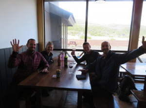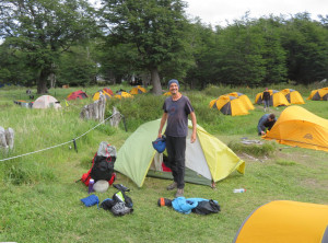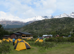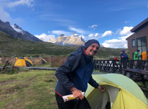 Die Etappe an unserem fünften Wandertag war knackig und kurz. Wir entfernten uns immer weiter vom Gletscher Grey und hatten nochmals die Möglichkeit unseren Blick über die Eiswüste wandern zu lassen. Es war windig und eine dicke Regenwolke schien uns zu verfolgen. Wir erreichten trockenen Fußes unser Ziel und schlugen in Windeseile unser Zelt auf. Noch schnell alle Sachen verstaut und dann fing es auch schon an zu regnen. An diesem Platz standen bestimmt 200 Zelte und es waren sehr sehr viele Touristen unterwegs. Diejenigen die nicht so weit wandern wollen, können diesen Platz auch ganz bequem mit dem Katamaran ansteuern. Wir verbrachten den Nachmittag mit Adrian, Gaby und Aaron, gönnten uns einen Wein und genossen durch die großen Fenster die schöne Aussicht auf den See und die Berge. Hier konnte man, wenn die Wolken es zuließen, die drei Türme des Torres quasi von hinten sehen.