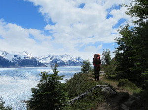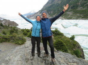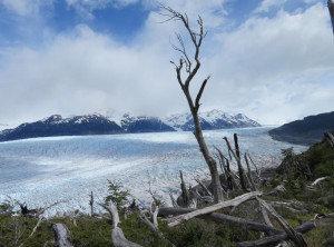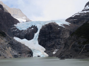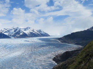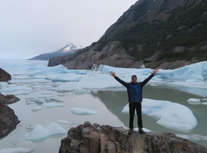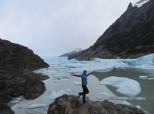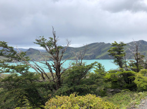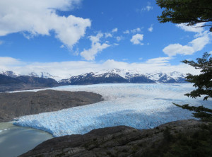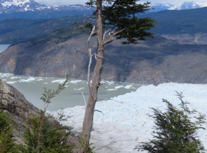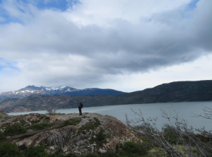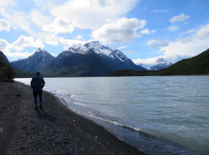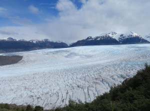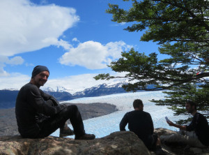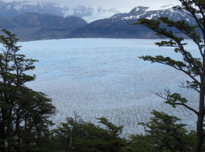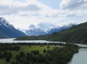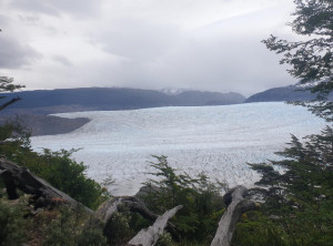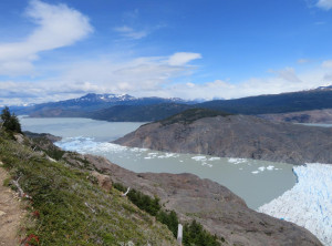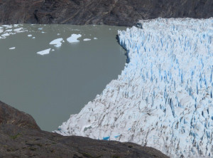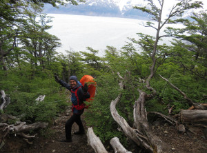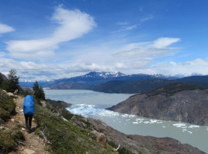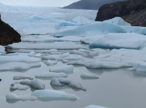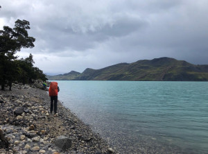 Die nächsten sieben Kilometer führten uns am Ufer des Lakes Grey entlang. Die Aussicht war einmalig. Ab und zu kämpfte sich sogar die Sonne durch und in Kombination mit dem auf und ab des Weges wurde uns nochmals richtig warm. Wir staunten immer wieder über das Wunder, welches uns die Natur hier bot. Nach insgesamt 9 h erreichten wir den vierten Campingplatz unserer Reise am Fuße des Gletschers Grey. An diesem Punkt der Wanderung treffen die „O“ Wanderer zum ersten Mal auf die „W“ Wanderer und einige Tagestouristen. Es war also Schluss mit der Gemütlichkeit und es mischten sich viele fremde Gesichter in unsere vertraute Gemeinschaft. Dennoch schafften wir es, uns beim Abendessen über die Erlebnisse des Tages auszutauschen. Besonders wird uns Adrian, den wir bereits ins Herz geschlossen haben, in Erinnerung bleiben. In der Hektik am frühen Morgen vor der Passüberquerung hat er vergessen, sein Zelt hinten an den Rucksack zu schnallen und stand nun ohne Zelt aber mit einem Lächeln im Gesicht da. Zum Glück konnte man vor Ort Zelte mieten, die zudem noch recht schick und besonders wetterfest sind. Am nächsten Morgen machten wir noch einen Abstecher zum Ufer des Sees und bestaunten die Eisberge aus der Nähe. Zurück am Quartier, tranken wir einen Kaffee und machten uns dann auf den Weg zum größten Campingplatz unserer Runde, dem Paine Grande.