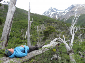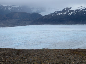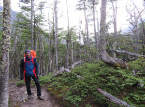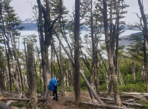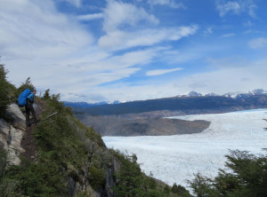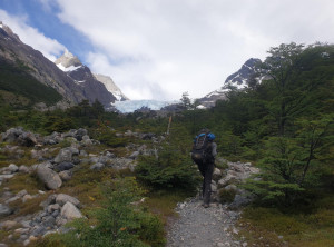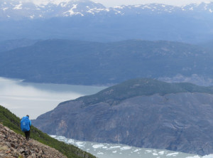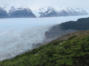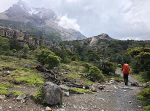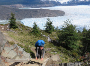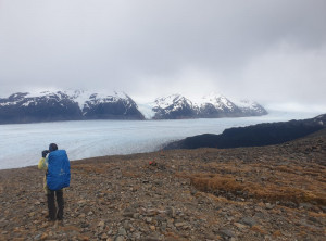 Nach etwa 3,5 h erreichten wir den höchsten Punkt des Tages und blickten zum ersten Mal auf die eisige Zunge des Grey Gletschers. Es war regnerisch und der schwache Wind eisig, im Grunde hatten wir Glück mit dem Wetter, da starker Wind hier oben oft die größte Herausforderung ist. Wir machten ein paar Fotos und weiter ging die Wanderung. Jetzt lagen 1200 m abwärts auf einer Strecke von 9 km vor uns. Einige Abschnitte waren so steil, dass es recht mühsam war, hinab zu steigen. Nach mehr als 2 h erreichten wir den kleinen Campingplatz „Paso“, an dem wir eine Rast einlegten. Die Temperaturen lagen weiterhin im einstelligen Bereich und eine Art Carport bot uns Schutz. Gemeinsam mit den anderen Wanderern freuten wir uns, die erste Etappe geschafft zu haben. Wir tranken einen warmen Tee und machten uns bald wieder auf den Weg.