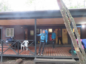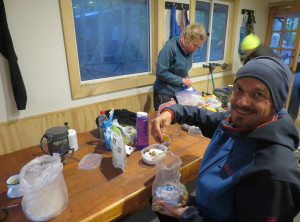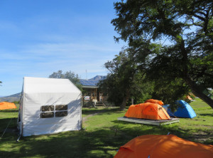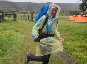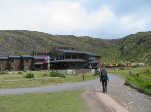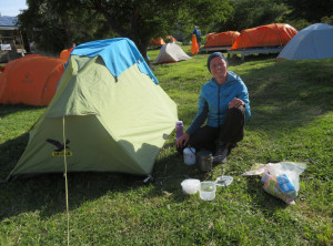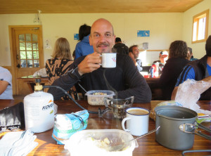 In der Nacht zog eine Regenfront auf, die sich auch hartnäckig bis mittags hielt. Im leichten Nieselregen mit eiskalten Fingern bauten wir unser Zelt ab. Wir streiften unsere Regencapes über und wanderten uns warm. An diesem zweiten Wandertag lagen 18 km und 330 Höhenmeter vor uns. Anfangs war es windig und grau. Neben uns waren etwa 40 andere Wanderer auf dem Weg. Wir trafen Adrian aus Polen, der sich am Wegesrand einem Kaffee kochte. Der Regen hatte aufgehört, da konnte man sich sich schon mal eine Pause gönnen. Für uns ging es weiter und mit jedem Kilometer wurde der Himmel blauer. Als wir unser Ziel, den Campingplatz Dickson erreichten, hatten wir einen klaren Blick über die umliegenden Berge. Wir packten aus und ließen das Zelt in der Sonne trocknen. Der Campingplatz ist wunderschön gelegen, auch hier gibt es warme Duschen, einen kleinen Shop und ein Holzhaus, in dem windgeschützt Essen zubereitet werden darf. Wir unterhielten uns mit den anderen Wanderern, die aus allen Teilen der Welt angereist waren: Kanada, Spanien, Belgien, England, USA, Frankreich und natürlich einige Deutsche und Schweizer.