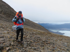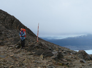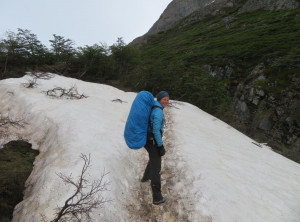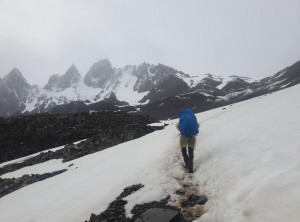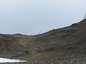 Am Morgen war das Zelt fix abgebaut, wir frühstückten und überpünktlich standen wir um 6:50 startklar bereit. Bei leichtem Regen und um die 5 Grad marschierten wir durch den matschigen Wald, weiter aufwärts auf einem Geröllfeld, bis wir schließlich durch den Schnee stapften. Unsere Rucksäcke waren zwar schon leichter als am ersten Tag, aber gerade bei den Metern nach oben merkten wir die zusätzliche Last, prima so wurde uns wenigstens nicht kalt.
